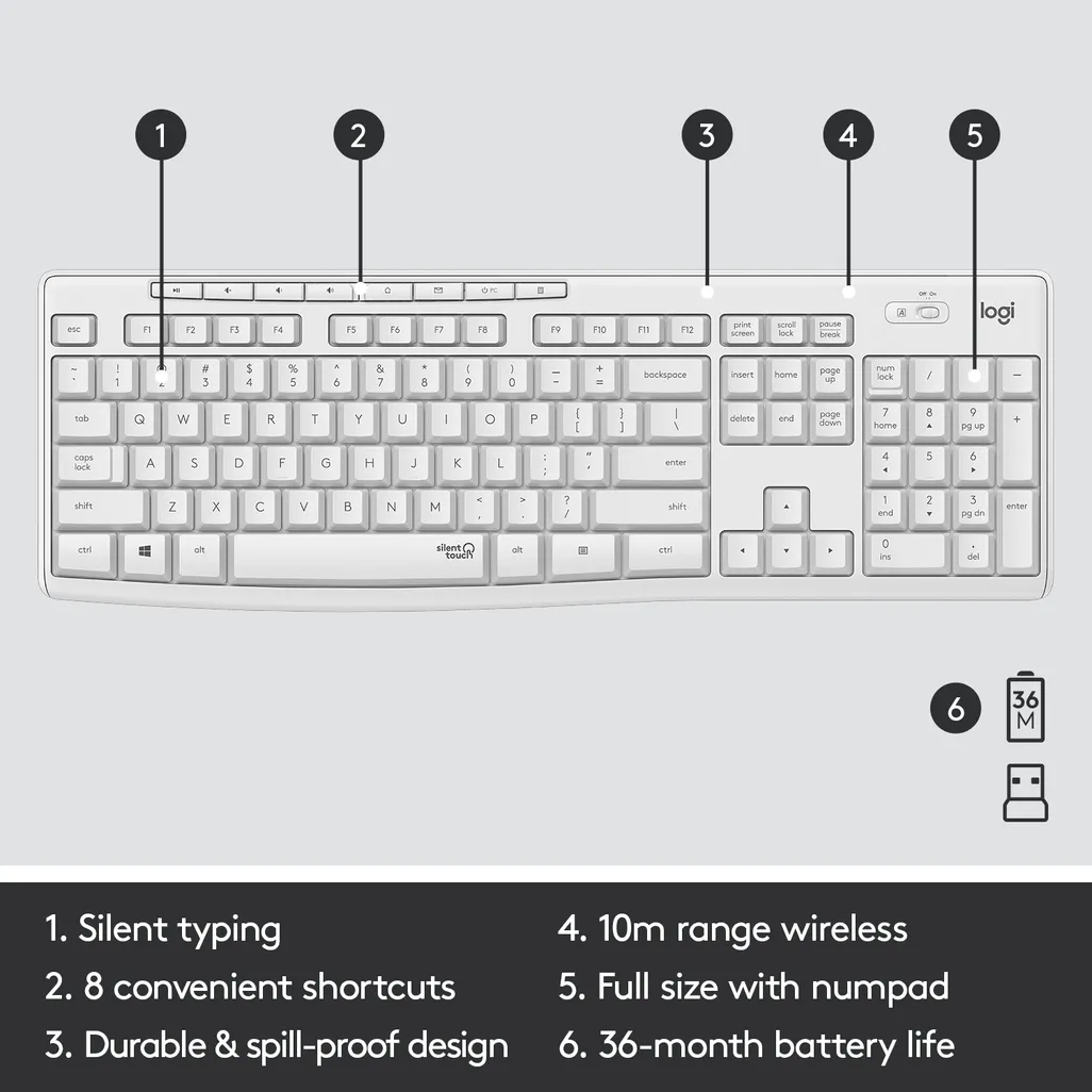 Logitech MK295 Silent Wireless Combo, Full-size (100%), Wireless, RF Wireless, QWERTY, White, Mouse included read more ↓ read less ↑