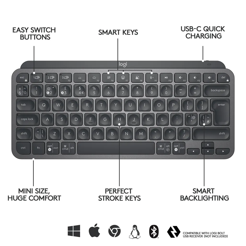 Logitech MX Keys Mini Minimalist Wireless Illuminated Keyboard. Keyboard form factor: Mini. Keyboard style: Straight. Connectivity technology: Wireless, Device interface: RF Wireless + Bluetooth, Keyboard layout: QWERTY. Backlight type: LED. Recommended usage: Office. Product colour: Graphite