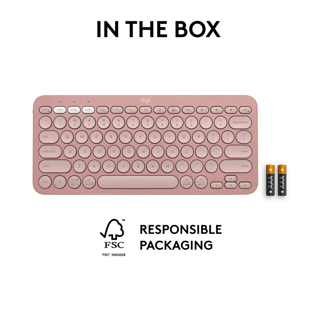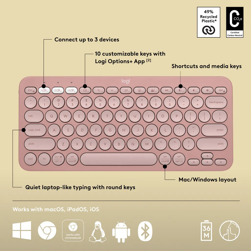 Logitech Pebble Keys 2 K380s, Mini, Wireless, Bluetooth, Scissor key switch, QWERTY, Rose read more ↓ read less ↑