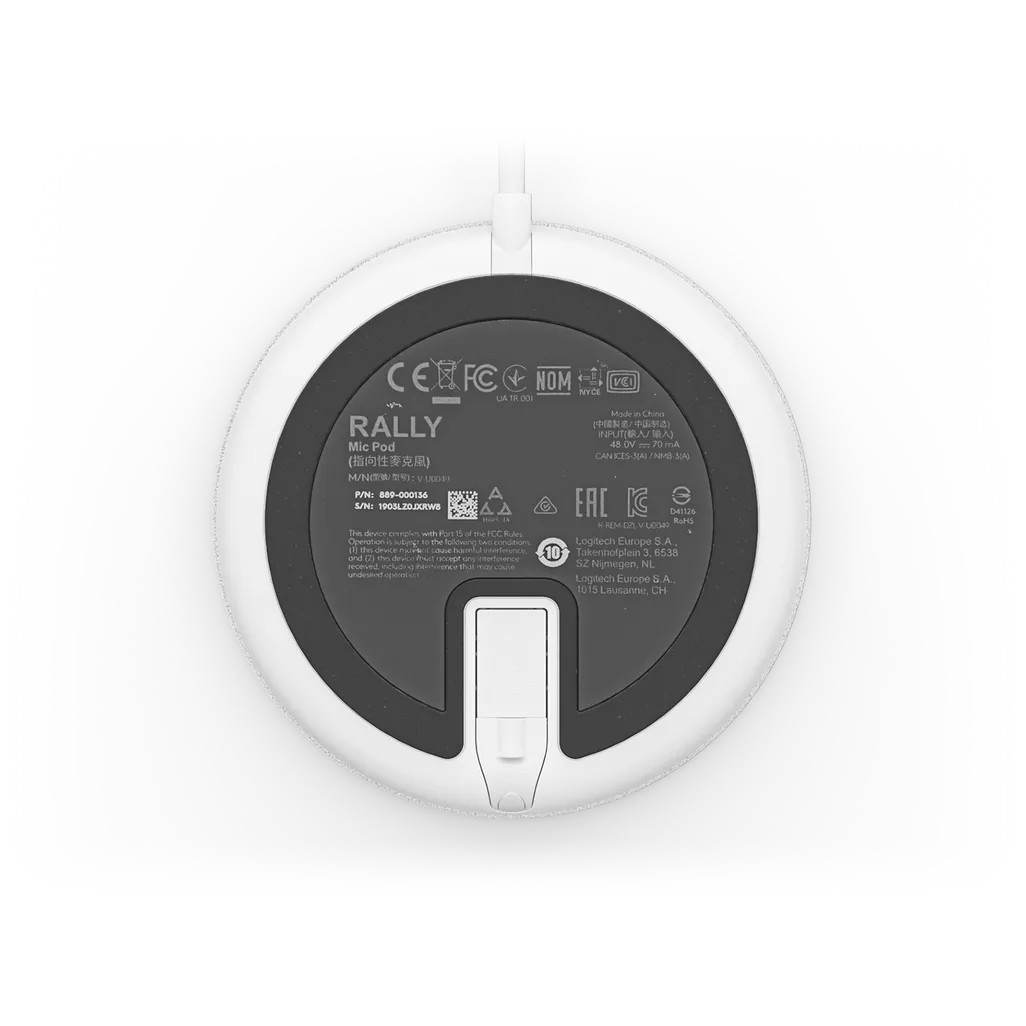 Logitech Rally Mic Pod. Type: Table microphone, Microphone sensitivity: -27 dB, Microphone frequency: 90 - 16000 Hz. Connectivity technology: Wired. Product colour: White, Cable length: 2.95 m, Windows operating systems supported: Windows 10, Windows 11, Windows 7, Windows 8, Windows 8.1. Height: 21 mm, Diameter: 10.2 cm. Package width: 48 mm, Package depth: 125 mm, Package height: 125 mm
