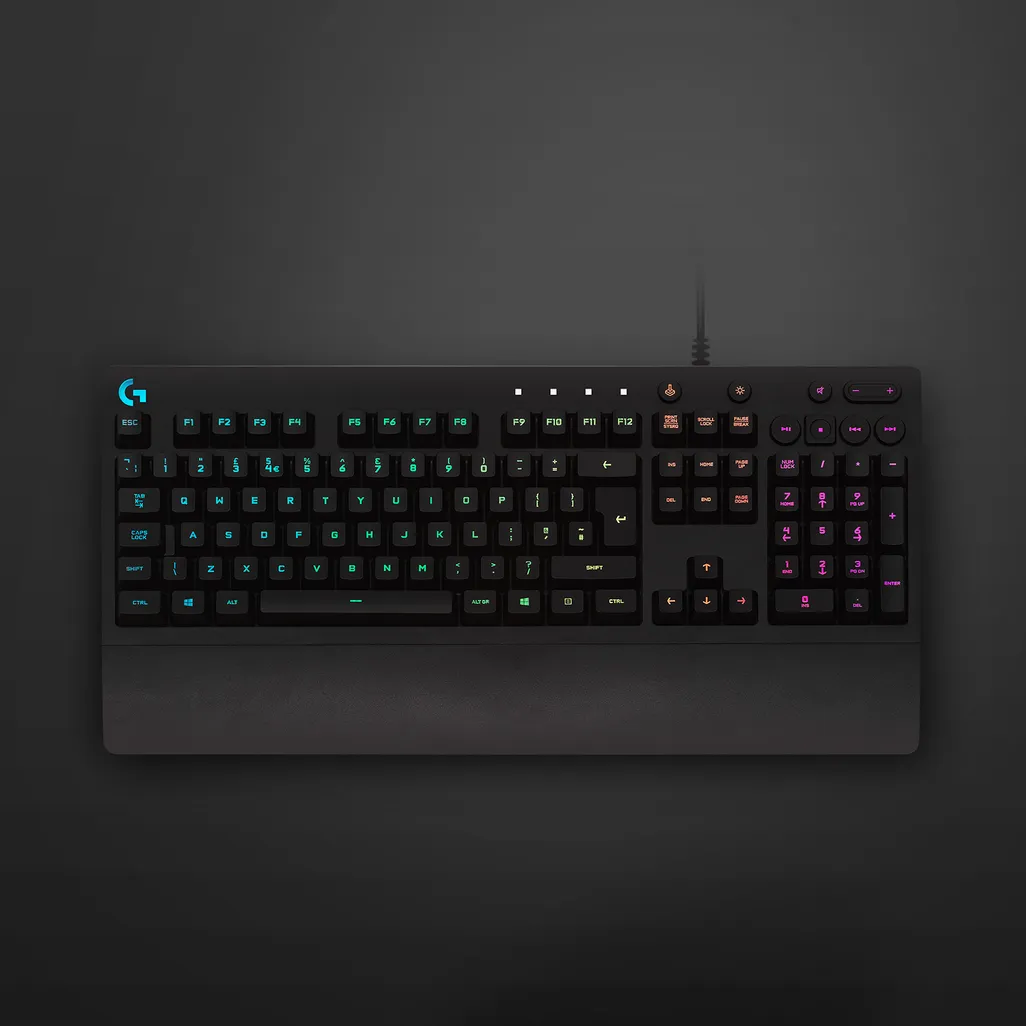 Logitech G G213 Prodigy Gaming Keyboard. Keyboard form factor: Full-size (100%). Keyboard style: Straight. Connectivity technology: Wired, Device interface: USB, Keyboard layout: QWERTY. Backlight type: RGB LED, Wrist rest. Cable length: 1.8 m. Recommended usage: Gaming. Product colour: Black