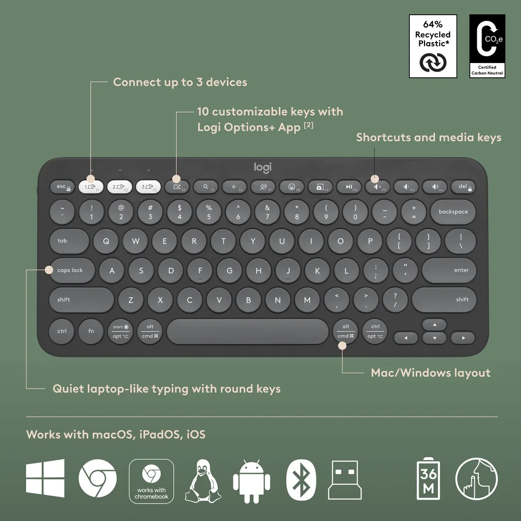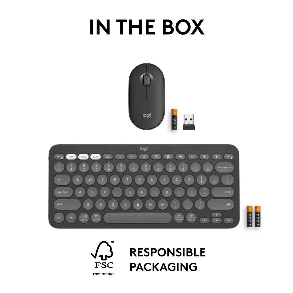 Logitech 920-012239. Keyboard form factor: Mini. Keyboard style: Straight. Connectivity technology: Wireless, Device interface: RF Wireless + Bluetooth, Keyboard key switch: Scissor key switch, Keyboard layout: QWERTY, Recommended usage: Universal. Product colour: Graphite. Mouse included